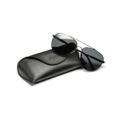 Piloten-Sonnenbrille, schwarze Gläser mit schwarzem Gestell.